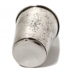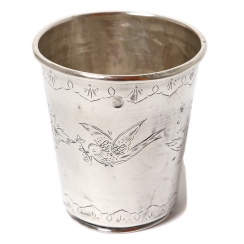 Серебряный стакан, декорирован цветочным узором и летящей ласточкой.