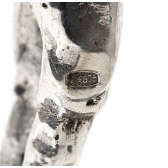 The lid is made of silver 875 fineness, it has he triple Russian hallmark - "the women’s head wearing a kokoshnik facing to the right" with letter "м"and number "875", where: "the women’s head wearing a kokoshnik facing to the right" – the national hallmark; "м" - code of the Moscow Assaying Office; "875" – the fineness mark.