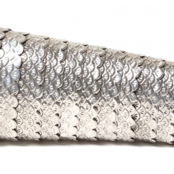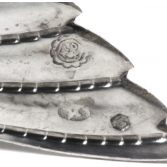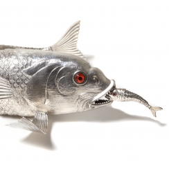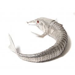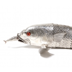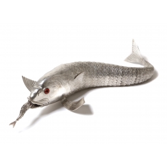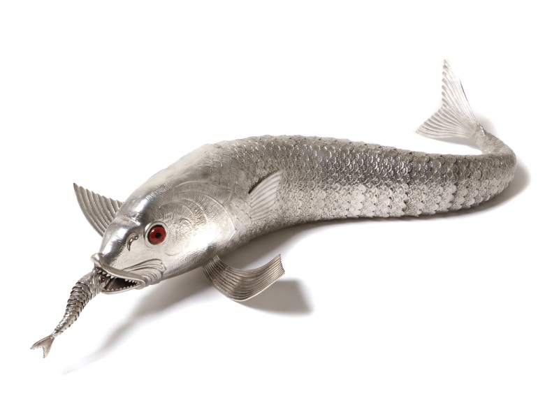 Большая серебряная рыба с подвижным телом, Испания, 717 гр, 915 пр, максимальная высота 10 см, длина (без рыбки во рту) 63,5 см