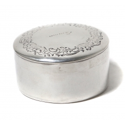 С гравировкой. Пара мелких вмятинок на ребре основания. ============================== Silver round pill box (or trinket box), lid decorated with floral ornament.