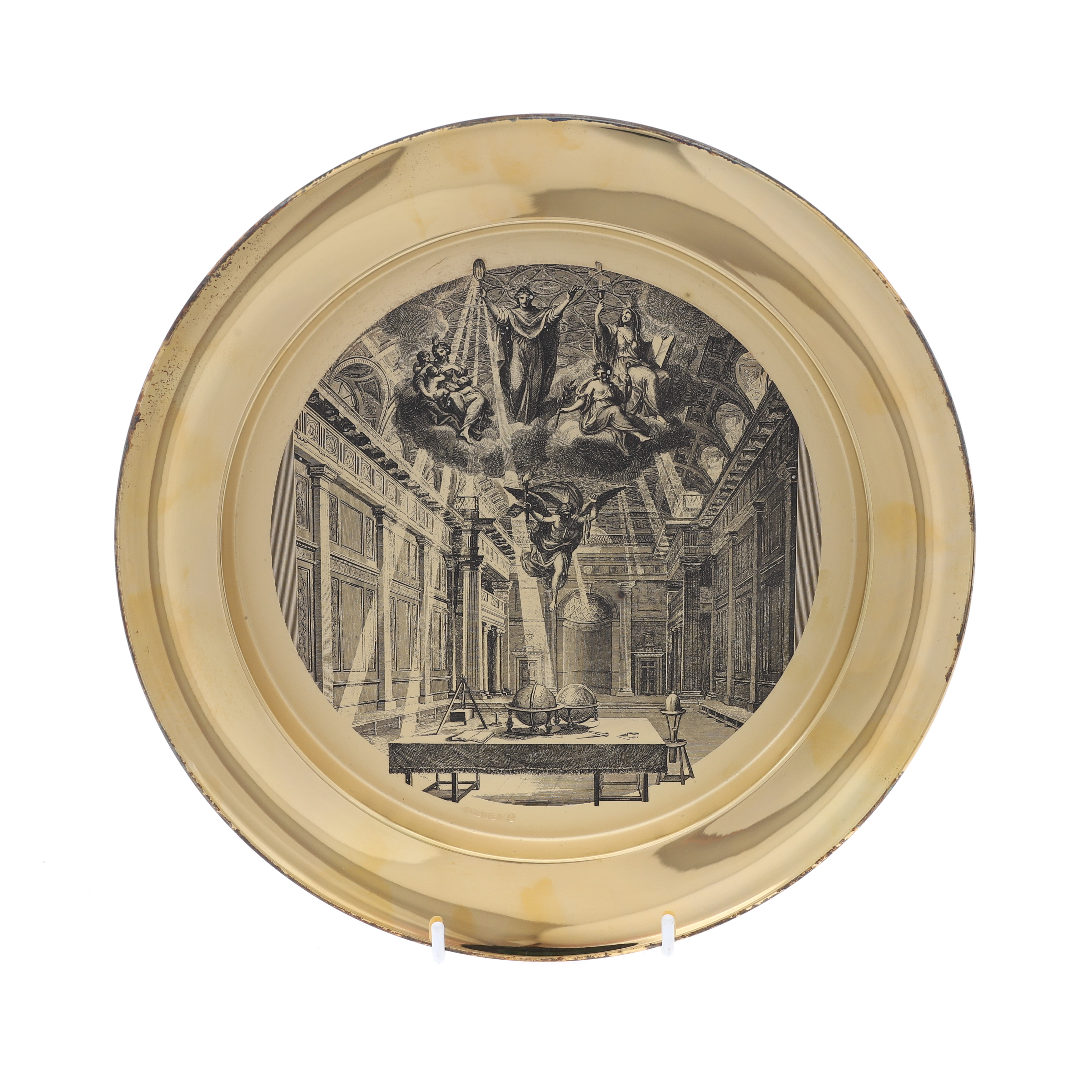 Серебряная тарелка с иллюстрацией (фронтисписом) из "Конституции вольных каменщиков" 1784 года издания. В раме со стеклом. Англия, г. Бирмингем, 1977 год.