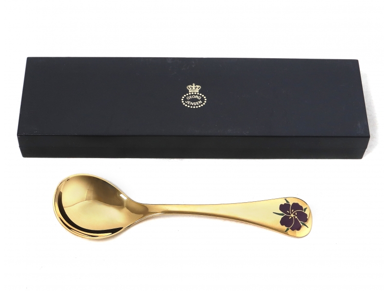 250679 - Серебряная годовая десертная ложка. Georg Jensen, 1980 годGeorg Jensen, Дания: Коллекционная годовая десертная ложка "Цикорий" 1980 года. Серебро, позолота, эмаль.