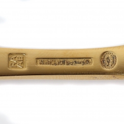 Надпись "GEORG JENSEN" в овале, обрамленная точками – клеймо дизайнерского дома "Georg Jensen", используется с 1945 года по настоящее время. "RA AB" - инициалы авторов дизайна Rigmor Andersen и Annelise Bjørner. Клеймо "Sterling Denmark" удостоверяет, что изделие выполнено в Дании из серебра 925 пробы.