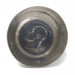 Высота: 4,7 см, диаметр верха: 5,5 см. Объём: 60 мл. Вес: 91 грамм серебра 925 пробы. =============================== Massive silver vodka cups (shot cup) with a medal at the bottom. Handmade (haands medet). Silver commemorative medal "The Wealth of Sweden" on the death of King Oscar II 1829-1907.
