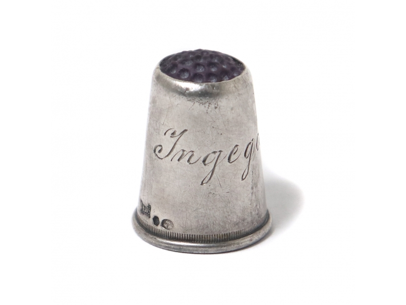 С гравировкой. ================== Silver thimble with purple insert.