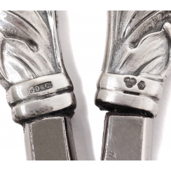 Длина: 12,3 см. Общий вес, включая стальное лезвие: 40 граммов, серебро 830 пробы. ============================== Scissors for grapes with silver handles and steel blades. Handles are decorated with bunches of grapes.