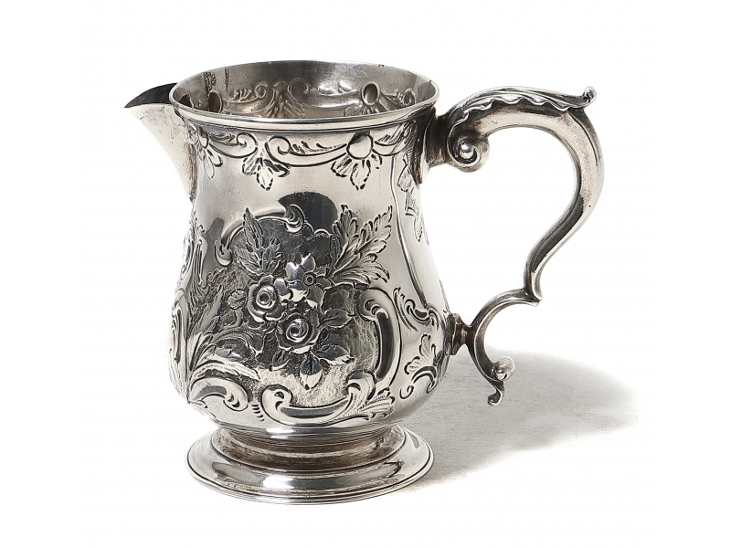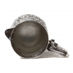 Серебряный молочник, декорированный цветочным узором.