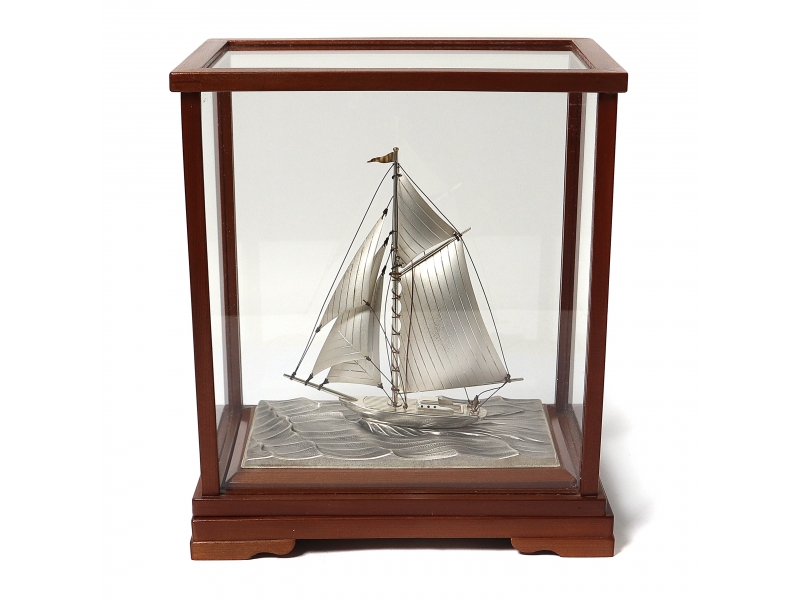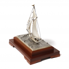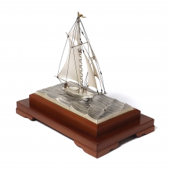 Серебряная модель парусного судна на посеребренной подставке в витрине. Ручная работа.