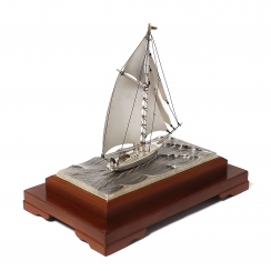 Вымпел и другие мелкие детали модели покрыты тонким слоем высокопробного золота. ============================= Silver model of a sailing ship on a silvered stand in a showcase. Handmade.