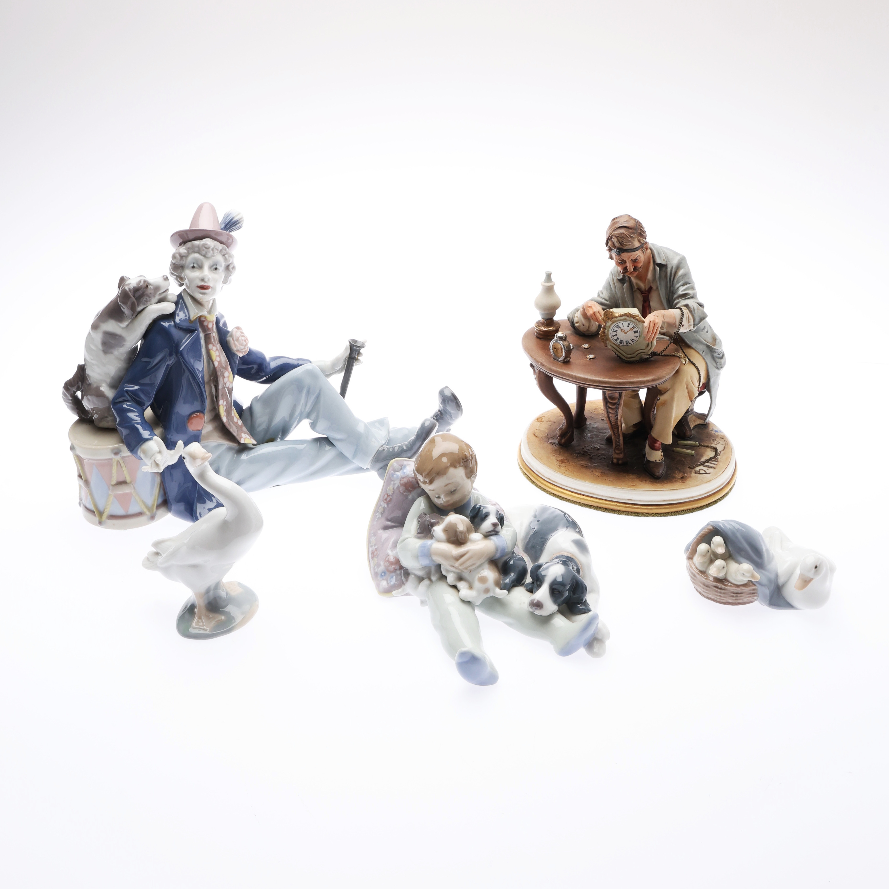 216776 - Спящие мальчик со щенками и собака, высота 9,3 см, длина 17,4 см, ширина 14 см, Испания, Lladro 389731 - Маленькая утка, LL_01014552 378649 - Утка с утятами в корзине, LL_01004895 302516 - Часовщик, высота 19,5 см, основание 17 х 15,5 см, Италия (?) 247166 - Клоун с собакой на барабане, высота 21,2 см, длина 29,8 см, Испания, Lladro