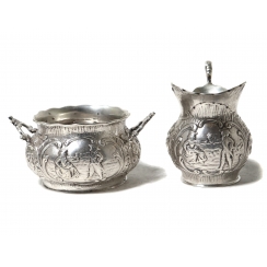 Общий вес: 239 граммов серебра 830 пробы. =========================== Silver sugar bowl and milk jug (creamer), decorated with floral ornaments and story miniature.