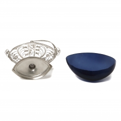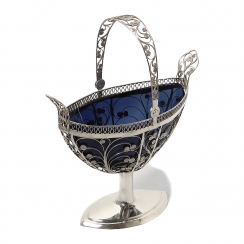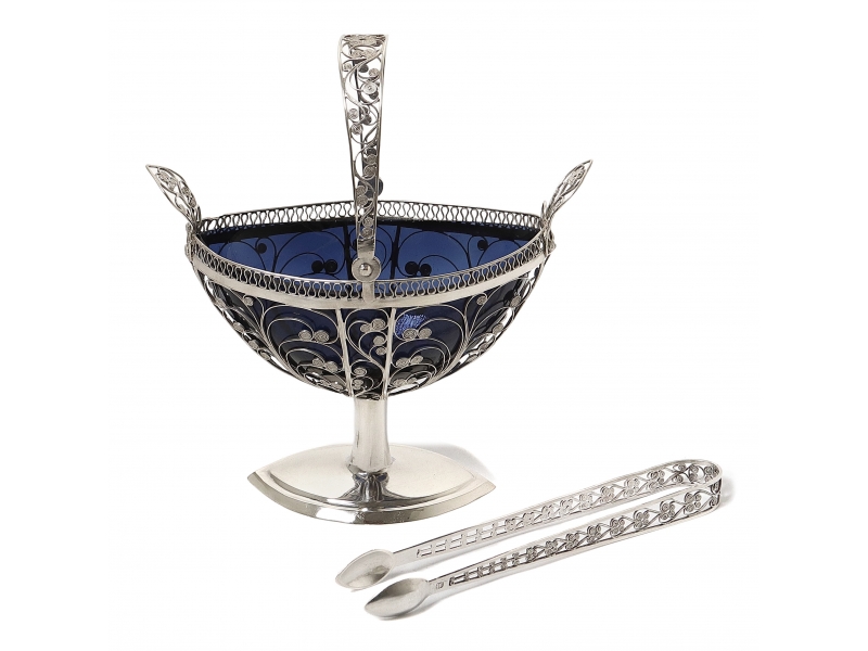 На краю стеклянной вставки несколько микросколов, не влияющих на эстетические свойства. =============================== Filigree bowl with a glass insert and tongs.