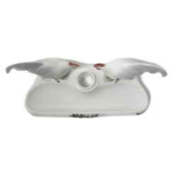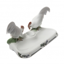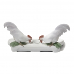 Фарфоровая подставка для чернильницы и ручек, декорированная двумя фигурками петухов. Ручная подглазурная роспись.