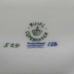Дания, г. Копенгаген, Royal Copenhagen, 1898-1923 гг. Скульптор: Christian Thomsen (годы жизни 1860 - 1921; годы работы на фабрике: 1898-1920) Номер модели: 524, производится с 1903 года. "158" - порядковый номер художника, расписавшего вазу, работал на фабрике с 1911 по 1931 гг. Клеймо производителя.
