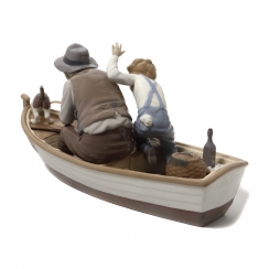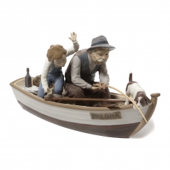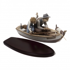 Большая фарфоровая фигура (статуэтка) "Рыбалка с дедушкой" на деревянной подставке. Ручная подглазурная роспись.