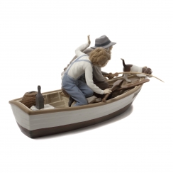 Без сколов, повреждений и без реставраций. =========================== Big porcelain figurine "Fishing with Gramps" on a wooden stand. Hand-painted underglaze.