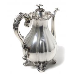 Coffee pot height of the grip on the lid: 22.5 cm. Volume: 1000 ml. Weight: 561 grams of silver 830 fineness.