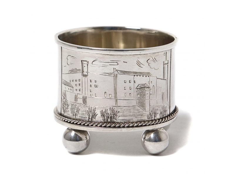 Серебряная солонка на ножках-шарах, декорированная изображением Ревельской крепости (Вышгородский замок).