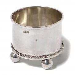 Пробирные клейма Эстонской Республики 1920-1924 гг., где: "Геральдическая лилия"- государственный знак удостоверения, подтверждает, что изделие выполнено из драгметалла, проба которого не ниже минимального стандарта, принятого в стране. "EW" (от Eesti Wabariik) - клеймо Эстонской Республики. Цифровое клеймо "84" удостоверяет, что изделие выполнено из серебра 84 золотниковой пробы (= метрической 875 пробе). ========================== Silver salt cellar on ball-shaped legs, decorated with an image of the Revel Fortress (Vyshgorod Castle).