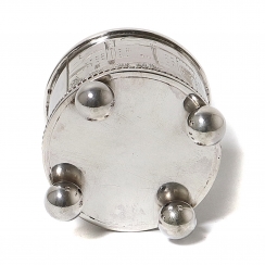 Height: 4.5 cm, diameter: 4.7 cm. Weight: 64 grams of silver 84 fineness in zolotniki ( = 875 metrical fineness).
