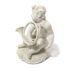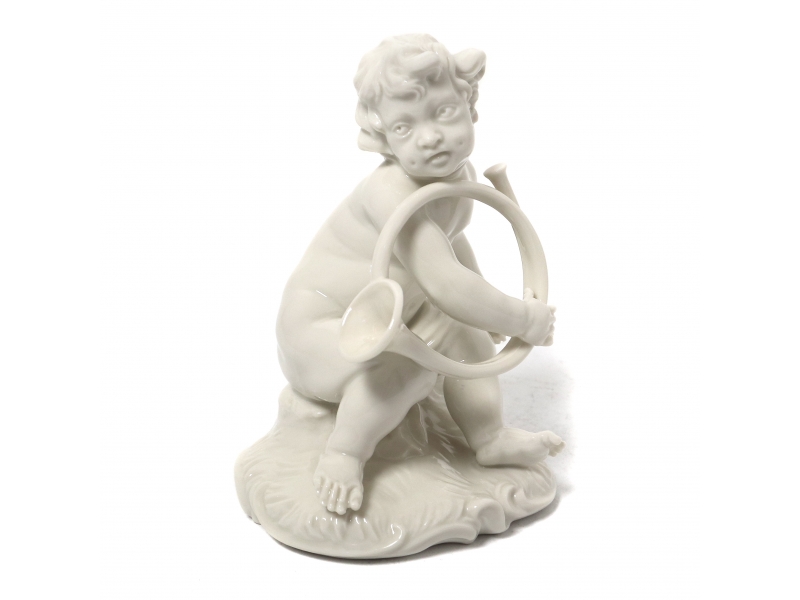 Фарфоровая фигура (статуэтка) "Путти с валторной". Нерасписанный белый фарфор. Белая глазурь.