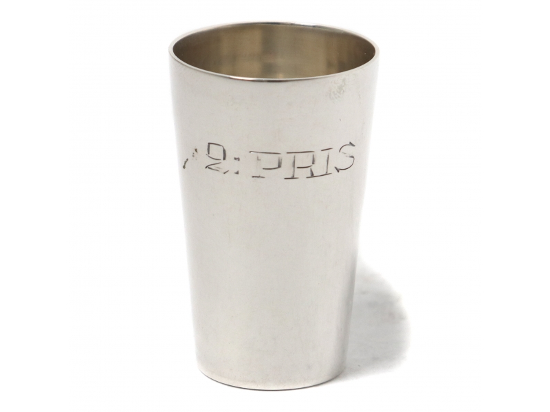 Высота: 5 см, диаметр верха: 3 см. Объём: 25 мл. Вес: 21 грамм серебра 830 пробы.