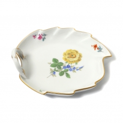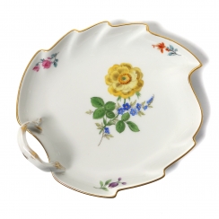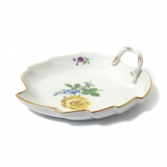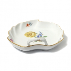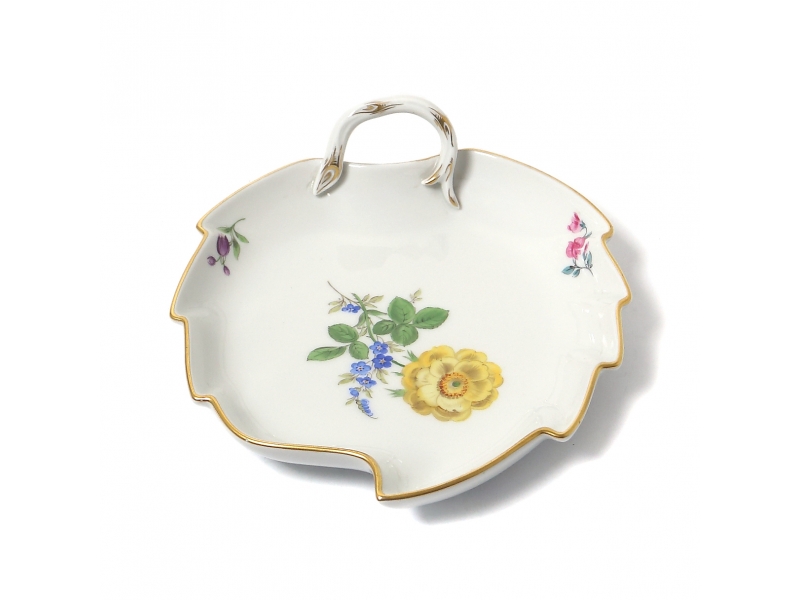 Без сколов, реставраций и повреждений. ============================ Porcelain bowl in the form of a leaf. The bowl is shaped like a leaf with wavy edges and a small curved handle. It is decorated with a hand-painted bouquet of flowers, as well as individual small floral motifs along the edges. The edges of the dish and the handle are accented with a gold rim. Pattern "Strewn Flowers". Hand-painted.