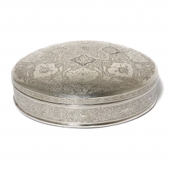 Диаметр: 16,5 см, высота с крышкой: 6 см, высота по край: 3,5 см. Вес: 492,5 грамма серебра 925 пробы. ============================ Silver box (casket), decorated with floral patterns and birds. Unique handmade, embossing.