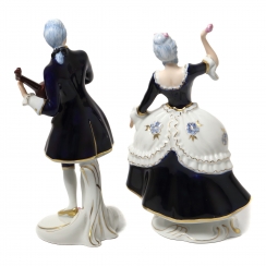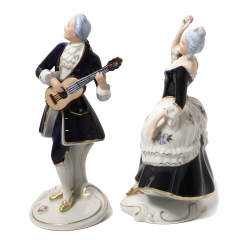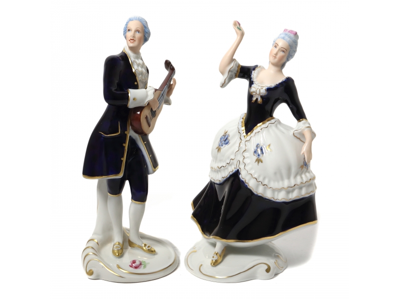 Две фарфоровые фигуры (статуэтки) "Танцующая дама с цветком в руке" и "Кавалер с гитарой". Ручная роспись.