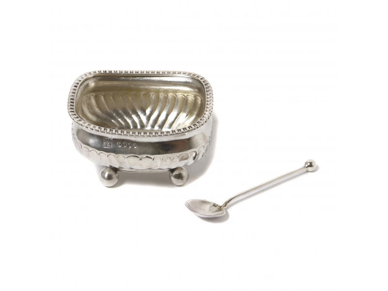 Salt cellar dimensions: length 6.3 cm, width 5 cm, height 4 cm. Spoon length: 6.5 cm.