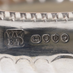 Солонка произведена в Англии, г. Лондон, 1889 год, мастерская Johnson, Walker & Tolhurst Ltd (Walter Walker & Brownfield Tolhurst) (годы работы: 1888-1903).
