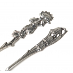 Длина: 10 см. Общий вес: 18 граммов серебра 830 пробы. ============================= Silver coffee spoons, 2 pcs. "Solros" and "Snödroppe" from series the "Wild flowers of Sweden".
