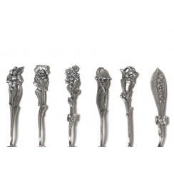 Длина: 10 см. Общий вес: 53 грамма серебра 830 пробы. ============================= Silver coffee spoons, 6 pcs. "Iris", "Ormöga", "Förgätmigej", "Blåklocka", "Viol", "Liljekonvalj" from series the "Wild flowers of Sweden".