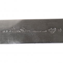 Длина: 24,5 см, ширина: 2,8 см. Вес: 144 грамма серебра 925 пробы. ================================ Silver letter opener (knife for paper or envelopes) with the coat of arms of the province of Västergötland. Designer Wiwen Nilsson.