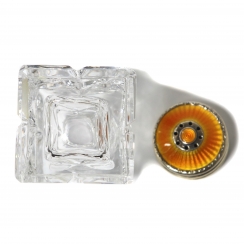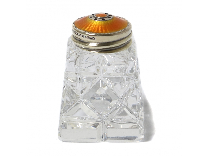 На гранях стекла несколько микросколов. =========================== Salt shaker. Glass, sterling silver of 925 fineness, orange guillash enamel.