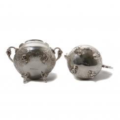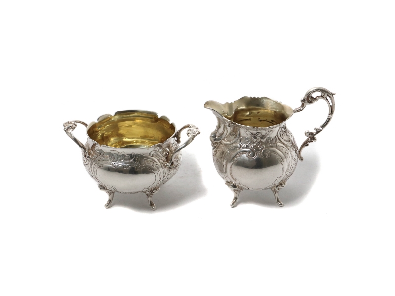 Серебряные сахарница и молочник, декорированные растительным орнаментом.