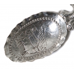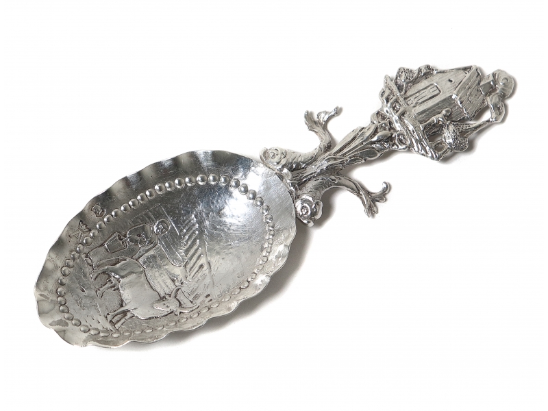 Серебряная сувенирная сервировочная ложка, декорированная сюжетной миниатюрой.