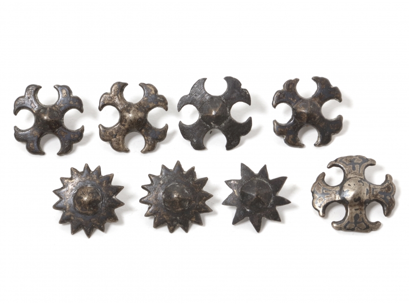 Четыре крестообразных пуговицы, размер: 2,5 х 2,5 см. Одна крестообразная пуговица, размер: 2,7 х 2,7 см. Две пуговицы в виде звезд, диаметр: 2,4 см. Одна пуговица в виде звезды, диаметр: 2,2 см. =============================== Collection of horse harness pads, 8 pcs. Silver plated metal, niello. Decoration for horse harness.