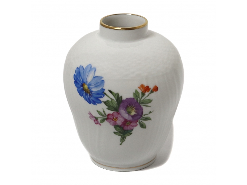 Фарфоровая ваза, декорирована изображением букета полевых цветов. Горловина и основание дополнены элегантным золотым ободком. Дизайн "Саксонский цветок". Ручная подглазурная роспись.