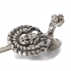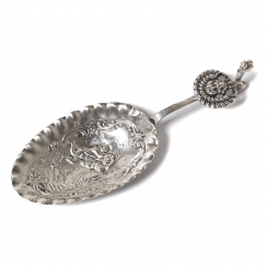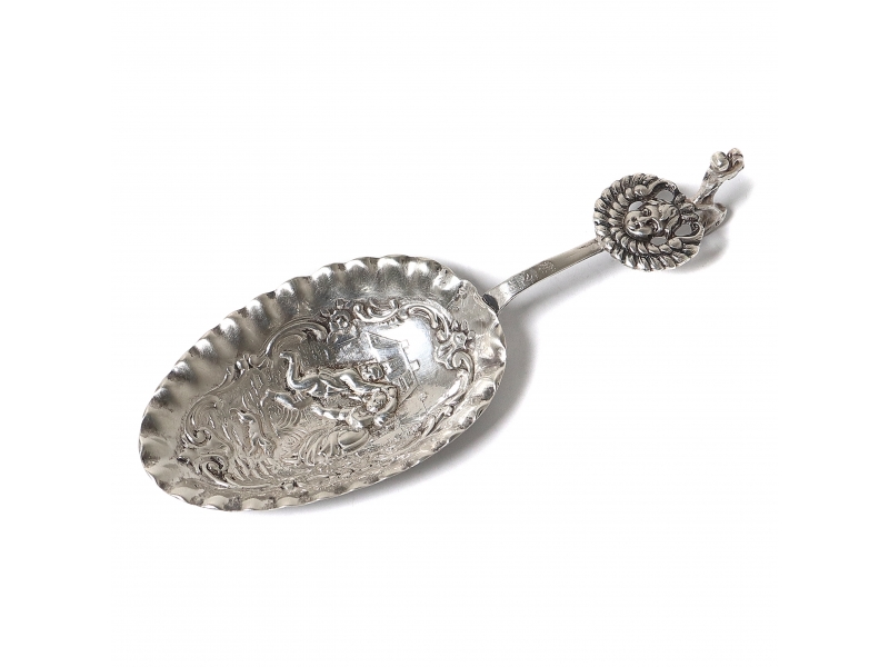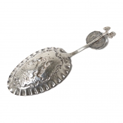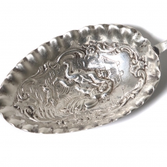 Серебряная сервировочная ложка, декорированная рельефной сюжетной миниатюрой.