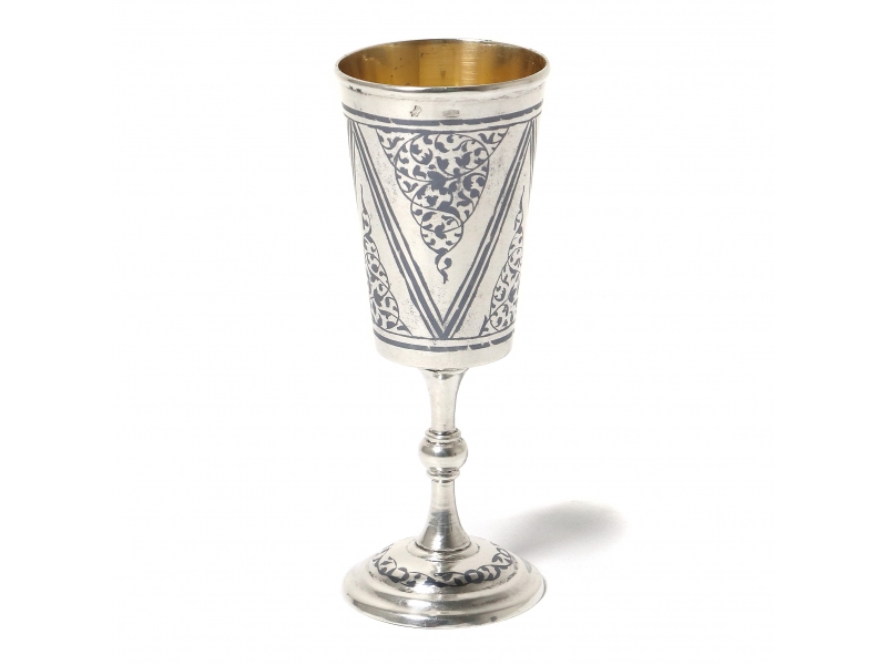 Высота: 11 см, диаметр верха: 4 см. Объём: 40 мл. Вес: 51 граммов серебра 875 пробы.