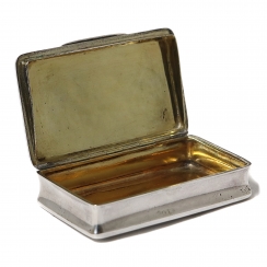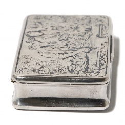 Серебряная коробка, декорирована гравированной пасторальной сценой в стиле рококо (по мотивам François Boucher): галантная пара на природе, с орнаментальными завитками по краю.