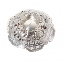 Высота: 5 см, диаметр верха: 13 см. Вес: 110 граммов серебра 925 пробы. ========================= Silver open-work bowl, decorated with plant ornaments.