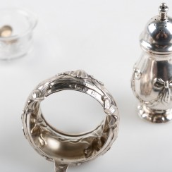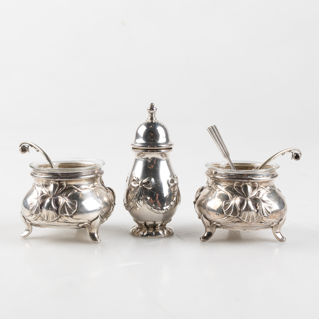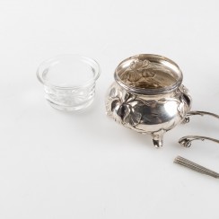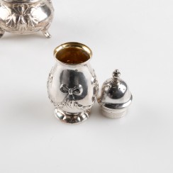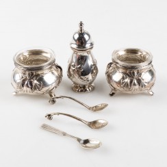 The salt cellar was made in Helsingborg, Sweden, workshop Johan Fredrik Tynelius (worked since 1870 to 1903). The spoon was made in Falun, year 1925, workshop Skreij J E (worked since 1915 to 1972).
