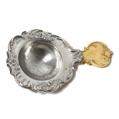 Длина: 16,7 см, диаметр: 10,2 см. Вес: 86 граммов, серебро 800 пробы. ======================= Silver strainer for tea, bone, decorated with floral pattern.