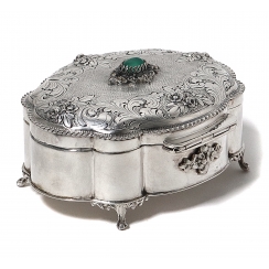 Серебряная шкатулка с зеленой вставкой, декорированная растительным орнаментом.
