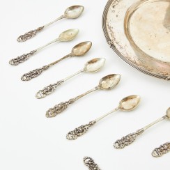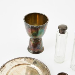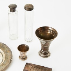 Информация о лоте 397077 - Подставка или поднос, 181 гр, 830 пр, максимальный диаметр 17 см, диаметр дна 11,3 см, высота полей 1,2 см 356496 - Стакан в виде кубка, 73 гр, 830 пр, высота 9,5 см, диаметр верха 7,5 см 381361 - Стопка в виде кубка, 13 гр, 830 пр, высота 4,5 см, диаметр верха 4 см 365905 - Мерный стакан бармена, 102 гр, высота 13,3 см, диаметр 8,2 и 6,2 см 383097 - Портсигар, 83 гр, 830 пр, 8,8 х 7 х 1,3 см (8,2 х 6,2 см) 376575 - Банка. Стекло, серебро 925 пр. Англия. Высота 15,4 см, диаметр 3,2 см, вес крышки 6 гр 319853 - Флакон. Стекло, серебро 925 пр. Англия. Высота 14,5 см, диаметр 3,5 см, вес крышки с пробковой вставкой 8 гр 370132 - Кофейные ложки, 6 шт, 37 гр, 830 пр, 9 см 336614 - Кофейные ложки, 6 шт, 37 гр, 830 пр, 9 см |