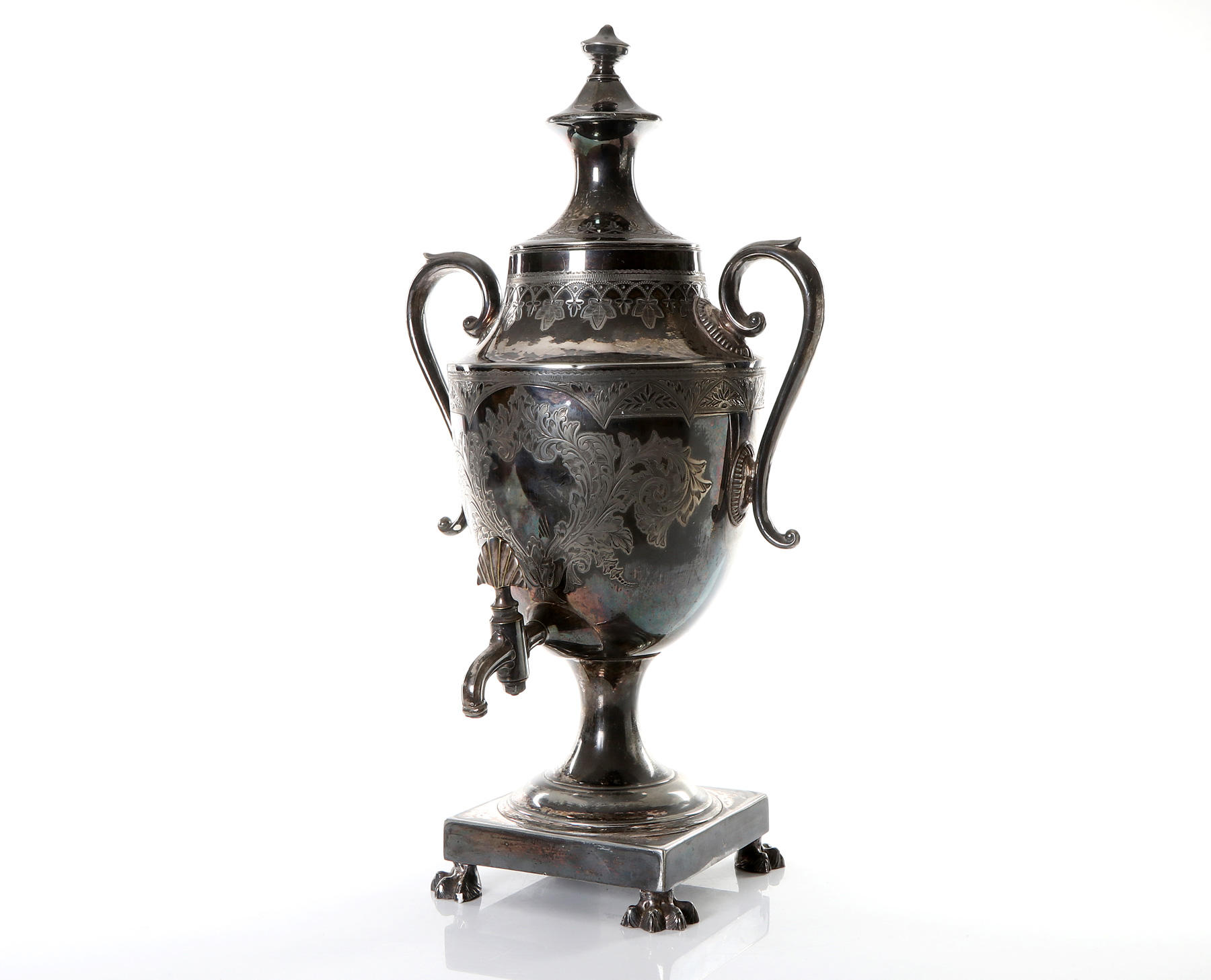 258307 - Посеребренная бульотка, конец 19 - начало 20 вв, максимальная высота около 54,5 см, размеры основания 18,5 х 18,5 см