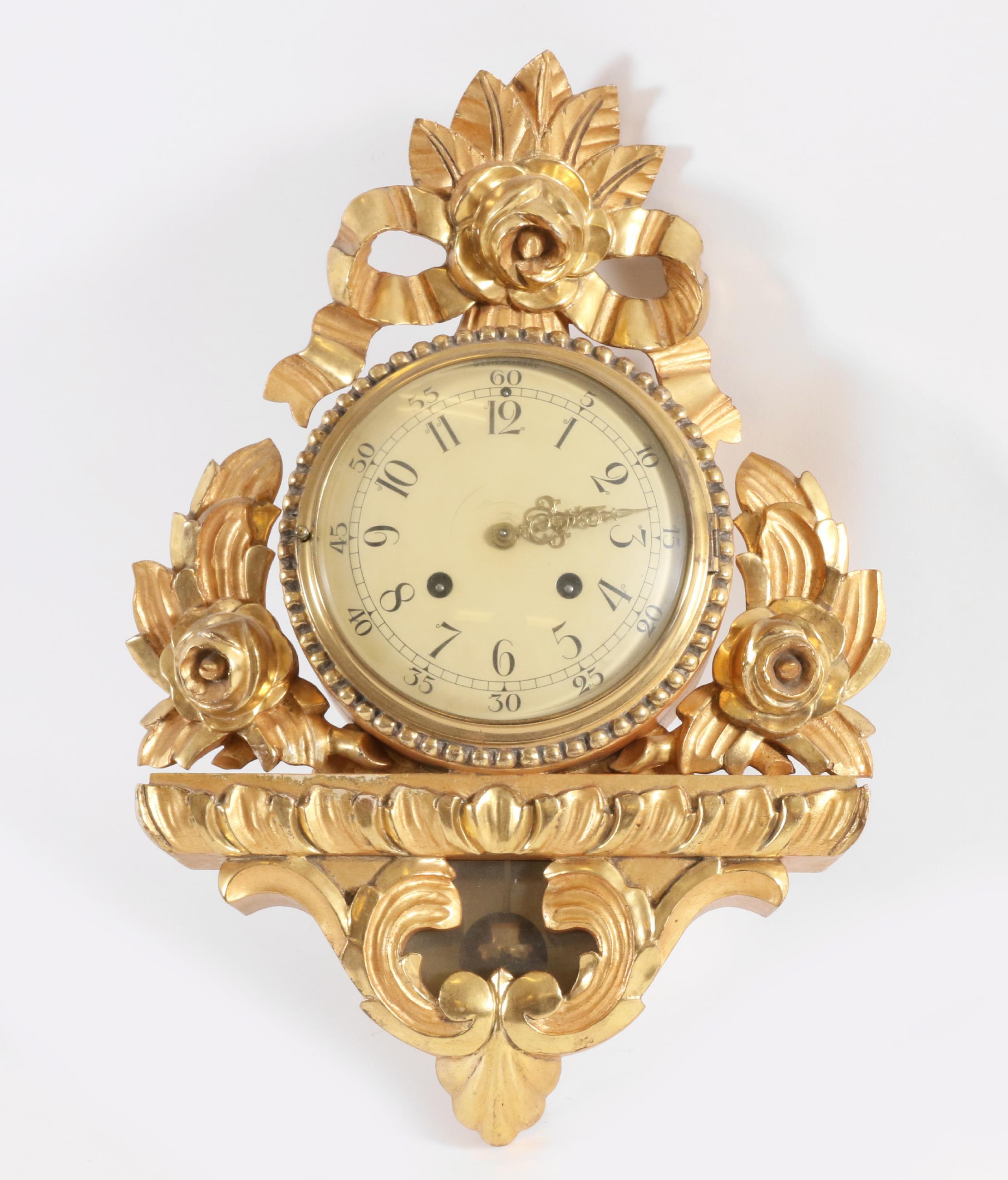 Максимальная длина 46,5 см, ширина 34, диаметр циферблата: 16,5 см. Маятник и ключ в комплекте. На корпусе несколько мелких сколов; царапины и потертости на позолоте