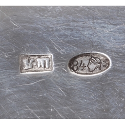 Triple Russian hallmark in the oval 1896-1908 - "the women’s head wearing a kokoshnik facing to the left" with number 84 and letters "АА", where: "the women’s head facing to the left" - national hallmark; "AA" - the initials of the assay master Artsibashev Anatoly Apollonovich (worked since 1886 to 1898; from 1898 to 1912 - manager of the Vilna assay district); "84" – fineness mark (84 fineness in zolotniki = 875 metrical fineness).